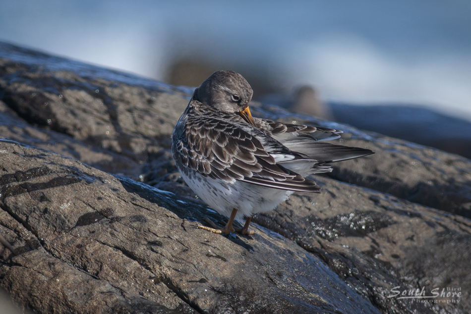 I noticed the Harlequin ducks close to shore one day and decided I wanted to photograph them if I could get down without them seeing me approach. I managed to hide behind a rock ledge as the tide was still coming and waited to see if they would get closer. They did. I took a few photos and from out of nowhere a flock of Purple Sandpipers flew into view. As I wondered about where they might be headed, the whole flock decided to land on the ledge I was lying on. I couldn't decide what to focus my camera on - the ducks were getting closer and the sandpipers were right in front of me. The light wasn't ideal, it was still mid-afternoon and the tide was still coming, threatening to get me wet. If you know Harlequin ducks you know they like feeding when the surf is high. I made images of both species until I had to retreat to higher ground. The sandpipers had already left the area. February 21.